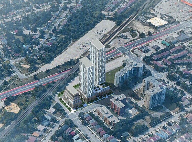 123 Bellamy Road North: a proposed 44, 35 & 9-storey market-rate rental development designed by Graziani + Corazza Architects for Hazelview Investments on the south side of Bellamy Road North, east of Cedar Brae Boulevard and north of Eglinton Avenue East in Toronto's South Cedarbrae—Eglinton East neighbourhood.