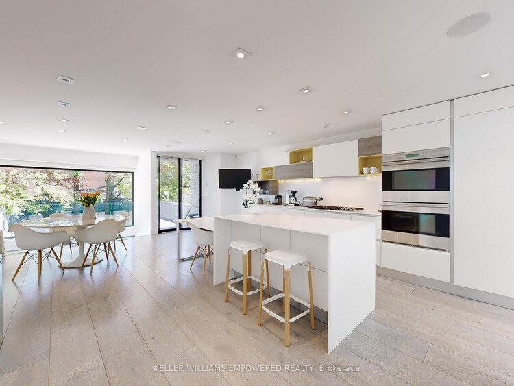 A bold contemporary residence in the heart of Yorkville, this meticulously maintained detached home offers rare privacy with only one immediate neighbour, none to the south or west, on one of the neighbourhood's most desirable streets.Wrapped in high density zinc and defined by clean architectural lines, the home features 3 bedrooms and 3 bathrooms across thoughtfully designed living spaces filled with natural light. A dramatic 26 foot foyer and floating staircase create an impressive first impression, while elegant porcelain and hardwood floors, stone countertops, built in speakers, and automated blinds elevate every level.The custom Scavolini kitchen is equipped with Wolf double ovens and gas cooktop, Sub Zero fridge and wine fridge, and Miele dishwasher, all beneath a stunning 23 foot atrium with skylight. Floor to ceiling windows and expansive sliding glass doors open to a private three tiered outdoor retreat with integrated speakers, perfect for seamless indoor outdoor living.The primary suite occupies its own level with a walk through Poliform closet and spa inspired 7 piece ensuite featuring a marble steam shower and heated porcelain slab floors. Heated driveway with parking for three cars, sprinkler system, and rough in for EV charger.Steps to Yorkville's premier boutiques, dining, nightlife, the Royal Ontario Museum, and TTC. A rare turnkey offering in one of Toronto's most coveted locations.