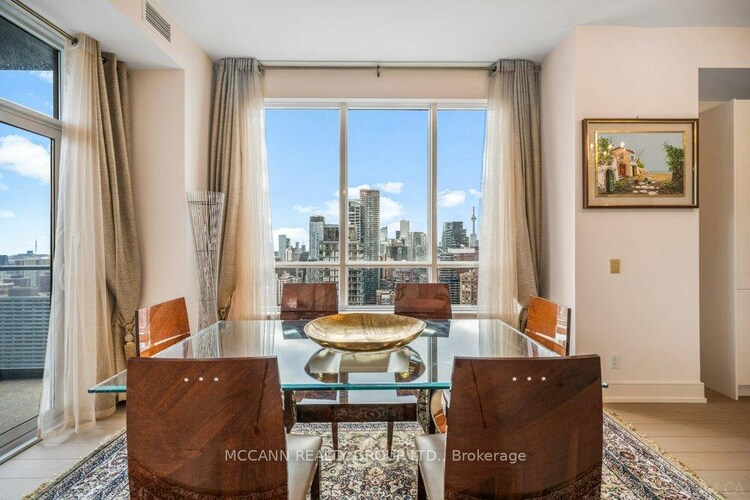 This unique suite in the heart of Yorkville offers unmatched luxury just steps from Toronto's most upscale shops and restaurants. Nestled on quiet Balmuto Street, just off the iconic Bloor Street, known as Toronto's Fifth Avenue, this residence blends elegance, privacy, and convenience. Perched high on the 33rd floor with only two other suites on the level, enjoy a quiet and private living experience. Featuring a larger-than-standard layout with generous living spaces, this two-bedroom, three-bathroom suite includes parking and a locker. The spacious, open-concept design and 10-foot ceilings give the home a bright, house-like feel, enhanced by floor-to-ceiling windows with stunning views of the city skyline and CN Tower. Tastefully renovated, the kitchen includes quartz countertops, a new backsplash, new sink and faucet, and brand-new stainless steel appliances. The suite has also been upgraded with new hardwood flooring throughout, a new toilet in the primary bath, and has been freshly painted throughout. 21 Balmuto offers top-tier amenities: a gym, yoga studio, spa, pool, party room, visitor parking, and 24/7 concierge. This is an exceptional opportunity to lease a spacious, elegant, turn-key suite in one of Toronto's most prestigious locations. A true gem, don't miss it!