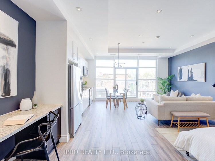 Beautiful Suite At The 'Lofts On Queen". A Quiet Boutique Low Rise Building In The Heart Of Leslieville With Only 8 Units. Open Concept Living/Dining Rooms, Lots Of Natural Sunlight, Tall Ceilings, Quality Modern Finishes, 540 SF. Feels Larger, Locker & Bicycle Storage, Roof Top Terrace With Gorgeous City Views. In Terms Of Convenience, Nothing Beats This Location, Close To Waterfront, Film District Studios, Shops/Restaurants & Parks. Literally Steps To Transit. This Unit Was Converted From a 1 Bedroom To A Beautiful Large Studio Space With Custom Wall Unit and Built-In Murphy Bed. Must See!