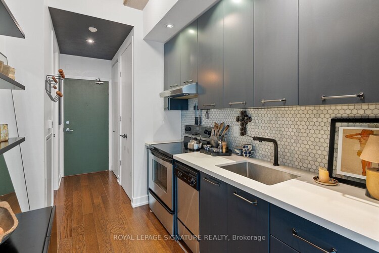 Luxury Loft Living at Twenty Stewart In This Expansively Modern 1 Bed Beauty - One of Only 59 Boutique Lofts in the Building! This Spectacular Soft-Loft Spans Over 500+ Sq Ft & Features Stylish Pops Of Colour, Exposed Soaring 10Ft Concrete Ceilings, A Concrete Accent Pillar, Exposed Ductwork, 10Ft Floor to Ceiling Windows & Smooth Hardwood Floors. Featuring A European-Inspired Pullman Kitchen with Upgraded Pentagonal Tile Back Splash, Sleek Quartz Counters, Stainless Steel Appliances & Plenty of Cabinetry. The Entire South Wing Of This Suite Is Wrapped By 10Ft Floor to Ceiling Windows, Framing The Open Concept Entertainer's Living/Dining Space. Open the Juliette Balcony For Some Fresh Air & Make This Space Feel Even More Light & Breezy! Retreat To The Primary Suite, Cleverly Lit Through A Frosted Clerestory Window & Enclosed By Frosted Sliding Doors - Enjoy A Super-Sized Triple Door Sliding Closet. The Spa-Inspired 4-Piece Bath Is Fully Upgraded With Matte Pentagonal Floor Tiles, A Mix Of Horizontal & Vertical Subway Tiled Walls That Waterfall To The Luxury 2-in-1 Shower/Soaker Tub, Ample Storage Space Tucked Away By Retro Under-Sink Cabinets & A Matte Quartz Vanity That Seamlessly Blends Stainless Steel Finishes. The Foyer Includes A Front Hall Closet & Ensuite Stacked Washer/Dryer!
