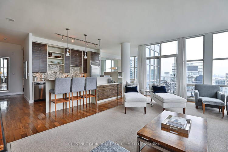 Fully furnished Penthouse in unbeatable downtown location. Perched above the city in a class of its own, this breathtaking 3 bedroom penthouse offers an extraordinary blend of elegance, comfort, and panoramic beauty. With sweeping views of both the skyline and the lake, you'll wake to glowing sunrises and unwind to unforgettable sunsets from your own private terrace. Inside, soaring 10-foot ceilings and an airy open-concept design create a light-filled, sophisticated living space. Brand new wide-plank oak hardwood floors and fresh, modern decor set a refined tone throughout. The renovated kitchen anchors the home with a stylish breakfast bar, generous prep space, and seamless flow into the living and dining areas - This rare offering features three spacious bedrooms and three beautifully renovated bathrooms. The primary retreat is separate from the other 2 bedrooms offering privacy, a luxurious ensuite and walk-in closet. Approx 2000 s.f of thoughtfully designed space provides exceptional storage, making penthouse living as practical as it is stunning. Privacy is paramount with only four penthouses on the floor. The residence also includes two parking spaces and two lockers - one being a large, separate room - a rare and valuable convenience downtown. Harbourview Estates is an established well liked building where residents enjoy access to the renowned 22,000 sq. ft. Super Club, offering resort-style amenities including a pool, fully equipped gym, basketball court, billiards, bowling, and more. A wonderful concierge team, pet-friendly policies, and an unbeatable downtown location just minutes to the Gardiner, Scotiabank Arena, Rogers Centre, and The WELL complete the lifestyle. Luxurious furnishings Perfect for professional athlete or executive- move in and elevate your everyday living to something truly exceptional. Speak to LA re short term. Rent is all inclusive of utilities. Weekly cleaning included. All Internet/Cable included.