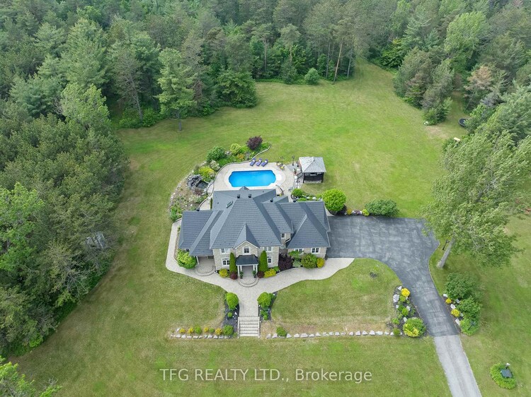 Welcome to an extraordinary opportunity to own a truly one-of-a-kind estate where luxurious living and natural beauty converge---all just minutes from the city. Custom-built by the renowned Storybook Homes and proudly maintained by its original owner, this five-bedroom residence is set on sixty acres of pristine, wooded land in Clarington, offering unparalleled peace, privacy, and distinction---with potential to create a family compound for generations to come. A stately gated entrance leads to a thoughtfully designed home that blends timeless architecture with modern comfort. Expansive, open-concept living spaces are filled with natural light, enhanced by soaring ceilings and large windows that frame picturesque views of the surrounding landscape. Quality craftsmanship and refined details are evident throughout, including an elegant steel roof with a lifetime warranty--- offering both beauty protection. Outdoors, your private oasis awaits... Spend warm days beside the sparkling in-ground pool, recently updated with a new liner, or unwind beneath your imported hand-carved tiki hut. A hot tub, outdoor kitchen, and flourishing perennial gardens elevate the space for both everyday enjoyment and memorable entertaining. Winding trails weave through the property, ideal for scenic walks or ATV rides. Though immersed in nature, the home remains conveniently close to amenities---just fourteen minutes from Costco, minutes to Highway 407 via Harmony or Brock Road, and a short drive to the 401. Families will value the school bus pickup right at the end of the driveway. Additional highlights include a triple-car garage, a paved private road for year-round access, skylights throughout, and high-speed Bell Fiber internet---perfect for remote work or multi-generational living. Offering a rare combination of serenity, sophistication, and accessibility, this exceptional estate is not just a home---it is a legacy in the making.