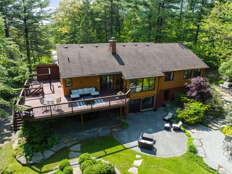 Set amongst mature trees, on approximately 6.17 acres, in an executive Burketon neighbourhood, this stunning raised bungalow offers a rare blend of privacy, character, and craftsmanship. The property welcomes you with a large paved driveway leading to a 3-car attached garage with interior access, plus a detached approx 15ft x 30 ft workshop with hydro - perfect for hobbyists or extra storage. Beautiful landscaping surrounds the home, featuring walkways, fountains, armour stone accents, multiple patio areas ideal for relaxing or entertaining and groomed trails for leisurely strolls through the trees. Enjoy the peaceful sounds of nature from the expansive deck overlooking the private yard. Inside, this home is rich in charm and design detail. The kitchen boasts quartz counters, a moveable centre island, built-in appliances, and a convenient walk-in pantry. The dining room features a walk-out to the deck and shares a striking, two-way wood-burning fireplace with the sunken living room. Here, large windows, a vaulted ceiling, and a floor-to-ceiling stone fireplace creates a warm, inviting atmosphere filled with natural light.The main floor hosts two generous sized bedrooms. The luxurious primary retreat boasts a walk-in closet and a spa-inspired ensuite, features heated floors, a soaker tub, and a tiled walk-in shower. The fully finished, walk-out basement offers exceptional living space with large windows that make it bright and welcoming. It includes two additional bedrooms (one with two closets, and the other with a walk-out to the yard and a woodstove), a 4-piece bath, a dining area and an open concept living space that overlooks the kitchenette. This area has ample cabinetry, quartz counters as well as a custom cherry wood wet-bar. This one-of-a-kind property seamlessly combines elegance, comfort, and natural beauty, truly a place to call home.