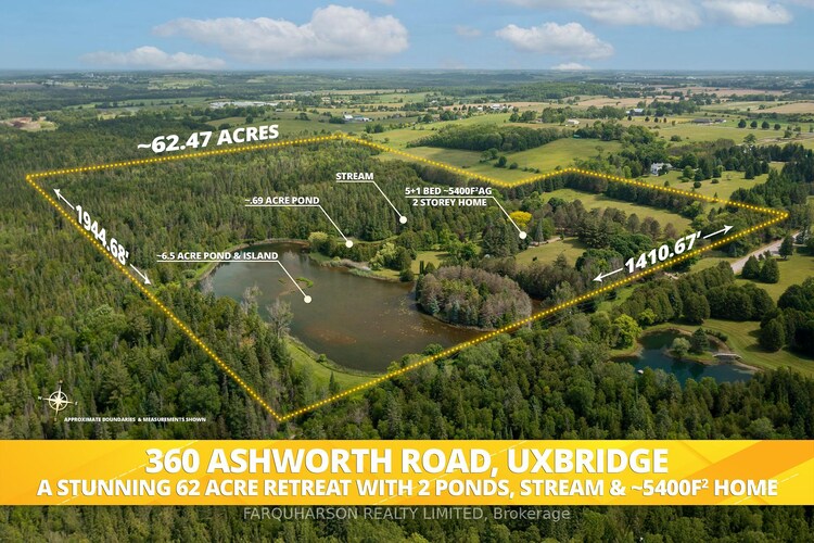 Discover timeless charm, modern comfort, and breathtaking natural beauty on this extraordinary 62-acre one of a kind retreat. This rare offering features over 7 acres of tranquil ponds including one with its own private island surrounded by mature trees, manicured grounds, and a peaceful, babbling stream.A long, winding driveway welcomes you to an impressive 5,400 square foot two-storey residence plus a partially finished basement, offering 6 bedrooms and 7 bathrooms. Thoughtfully designed with multiple walkouts, this home captures panoramic views of the lush landscape and serene waters from nearly every room.Inside, you'll find a blend of elegance and functionality. Two main floor bedrooms, including one with a walk-in dressing room and private ensuite. Three additional bedrooms on the second level, along with two fully renovated bathrooms featuring heated floors, an upper-level recreational room with a wet bar and gleaming hardwood floors throughout.The lower level offers flexibility with a separate entrance, bedroom, living area, and kitchenette perfect as a guest suite or in-law setup.Whether you're canoeing across the pond, reading beside the stream, or casting a line for an afternoon of fishing, this estate is a true nature lover's paradise.Located on a quiet road just 8 minutes from Mount Alberts shops and dining, and only 20 minutes to Highway 404 and all the amenities of Newmarket this is the perfect blend of rural tranquility and modern convenience.