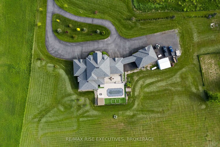 Welcome to your dream retreat in Glenburnie-an exquisite custom home by Legacy Fine Homes, nestled on 7 rolling acres of lush countryside. Through electronic gates and up the private asphalt drive, this majestic property reveals itself with two attached 2-car garages and a detached 2-car garage featuring a built-in office. Inside, luxury meets thoughtful design. The main floor offers a sun-filled living room with fireplace and walk-out to the sunroom, an elegant dining room, and a gourmet kitchen with quartz countertops, waterfall breakfast bar (seats 6), high-end appliances, and walk-out to an enclosed BBQ area. A main floor bedroom, stylish 3-piece bath, office, and mudroom complete the level. Upstairs, the primary suite impresses with two walk-in closets and a spa-inspired 5-piece ensuite. Two additional bedrooms share a semi-ensuite 3-piece bath with dual vanities, and the laundry room adds convenience and charm. The lower level features a spacious family room, gym with walk-out to the garage, a 4-piece bath, and a fifth bedroom-ideal for guests or extended family. Step outside to an entertainer's paradise: inground pool, hot tub, fire pit, stone patio, and pergolas-all surrounded by serene fields and quiet country air. Just 6 minutes to Hwy 401 and 15 minutes to downtown Kingston's shops, dining, and entertainment.