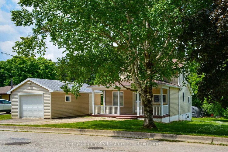 Beautiful mature lot in the heart of Markdale! Welcome to 124 Lorne Street, a charming 1.5-storey home set on a generous 61' x 132' lot surrounded by established trees, offering a peaceful setting within town limits. Featuring 3 bedrooms and 2 bathrooms across approximately 1,200 sq ft, the home offers a functional layout with bright living and dining spaces, a kitchen with pantry, and a sunroom overlooking the backyard. Upstairs, you'll find three comfortable bedrooms and a second full bathroom. Recent improvements include updated flooring, trim, and modern light fixtures with added pot lights, bringing a fresh feel to the interior.The outdoor space is a standout, with a deep lot, mature landscaping, and a backdrop onto a neighbouring church property that offers a uniquely open rear setting. A detached garage with hydro and private driveway provide added convenience. Situated in a quiet, friendly neighbourhood known for its great sense of community, and within walking distance to shops, parks, and amenities. Just a short drive to Owen Sound, Hanover, and Collingwood; enjoy small-town living in the growing community of Markdale.