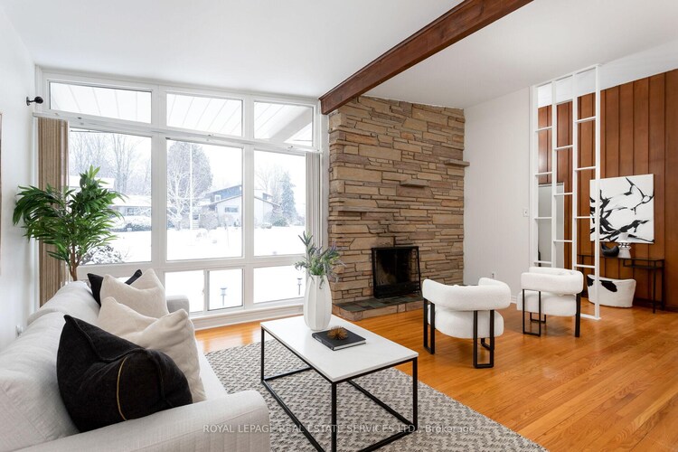 Perfect choice in sought-after Falgarwood! This charming 3-bedroom bungalow is set on a rare premium 93' frontage with a deep, private lot backing onto lush woodlands-offering a peaceful, nature-inspired setting that is increasingly hard to find in Oakville. Located in a mature, established neighbourhood surrounded by scenic parks and trails, this home delivers both tranquility and everyday convenience. Just minutes to Upper Oakville Shopping Centre for groceries, dining, and daily essentials, close to Oakville Place Mall, and with quick access to the QEW/403 and Oakville GO Station, the location is ideal for commuters and families alike.Beautifully maintained with inviting curb appeal, the property features an oversized driveway accommodating up to 6 vehicles, plus a double car garage. Mature trees create a private backyard retreat, where a spacious deck offers the perfect setting for outdoor relaxation or entertaining. Inside, the home showcases unique architectural details including cathedral ceilings, two wood-burning fireplaces, and hardwood flooring with updated baseboards throughout the main level.The L-shaped living and dining area is ideal for both formal entertaining and relaxed family living. The bright kitchen offers ample cabinetry, stainless steel appliances, and a cozy breakfast area with walkout to the freshly painted deck and serene backyard. The main floor includes three well-proportioned bedrooms, all with hardwood flooring, a 4-piece bathroom, and a private 2-piece ensuite in the primary bedroom.The finished lower level expands the living space with a freshly painted, oversized recreation room complete with a built-in bar-perfect for hosting gatherings or creating a comfortable family retreat. A wonderful opportunity to own a solid bungalow on a premium lot in one of Oakville's most established and desirable communities.
