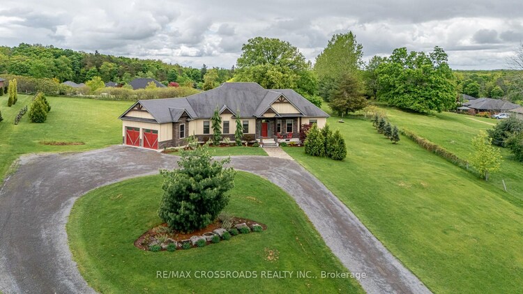Welcome to this exquisite custom-built board-&-batten & stone bungalow, perfectly perched on a private, elevated lot in the exclusive executive enclave of Hearth Stone Ridge Estates. Exuding luxurious rustic charm, the open-concept main floor boasts soaring vaulted ceilings with exposed wood beams, rich hardwood floors, & a magnificent floor-to-ceiling stone fireplace. The chef's dream kitchen features gleaming granite counters, an oversized breakfast bar island, a pull-out pantry, & a premium gas stove complete with a convenient pot filler. Retreat to the primary suite showcasing a cozy built-in window seat, a custom headboard, a massive walk-in closet with more built-ins, & a gorgeous ensuite bath with his-&-hers sinks. Two additional spacious bedrooms & a 4-piece bath complete the main sleeping quarters, while a stylish mudroom offers laundry, more granite counters, a conveniently located 2-piece powder room, & inside entry to the oversized double-car garage with an excellent storage. The fully finished walk-out basement is an entertainer's paradise, offering an enormous rec room, cold storage, a large bonus bedroom, a beautifully tiled 3-piece bath with a touch-lit mirror, & an acoustically resilient games room complete with an included pool table. Step outside from multiple access points to the private covered interlock stone patio equipped with a virtually new Napoleon BBQ with gas hook up & take the flagstone path to warm up by the firepit. Enjoy the rare financial benefit of natural gas heating combined with rural well & septic, plus the everyday convenience of central vac. Experience the perfect blend of country tranquility & high-end executive living!