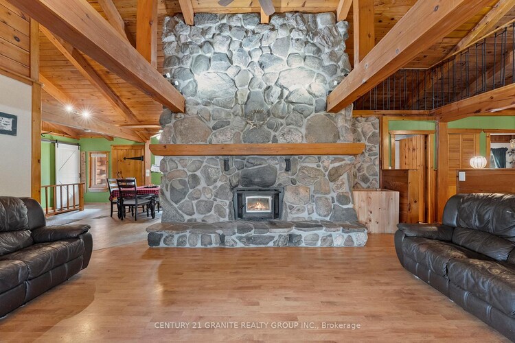 Location, location! Nestled in one of Birds Creeks most popular subdivisions, this picture-perfect 3+1-bedroom log home offers the warmth of country living with modern comfort. Step inside to an open-concept layout featuring a stunning floor-to-ceiling stone wood-burning fireplace, the heart of the home. You'll love the charming loft, the primary bedroom with 2pc ensuite, and the finished basement with a spacious rec room and office perfect for family fun. Enjoy summer evenings in the screened-in porch overlooking a large yard and your very own view of the kids' playground. There's even a 1.5-car garage and plenty of outdoor space to enjoy. Set on a generously sized lot, this home is move-in ready and perfect for families or those looking for a peaceful community setting just minutes from Bancroft.
