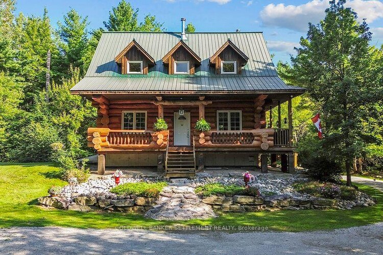 Priced to sell...this rare log home retreat offers the serenity of country living with lovingly maintained grounds as part of the 26 acre parcel. The custom-built log home is perfectly suited for remote work or a peaceful retirement escape. Close to historic Perth, the property welcomes you down a scenic winding laneway past a spring fed pond, and natural stone pathway to the open porch. Inside a newly renovated kitchen complete with new stove and refrigerator, blends modern function with timeless antique charm. The soaring log framed vaulted ceilings flood the living space with light and a central high efficiency wood burning fireplace supplements the propane furnace to all corners of the home. The loft level primary bedroom features a private ensuite while the main floor offers a 2nd bedroom or flexible office space. The finished walk out basement adds a full bath, cold storage and potential for a 3rd bedroom. Major updates in 2024 includes all exterior logs professionally sand blasted and stained. A new furnace in 2024 and hot water tank. Outdoor amenities include a single car detached garage, gazebo and pergola, chicken coup and additional outbuildings. This is a rare opportunity to own a private beautifully crafted log home where comfort, character and country charm come together.