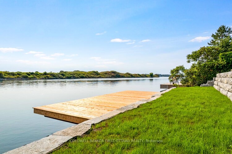 On the mighty St Lawrence River where its proud history and scenic beauty meet, you have new 2022 walkout bungalow offering luxury lifestyle with breath-taking river views. Located on peninsula in quiet bay, the home has two distinct waterfronts - each with a dock for swimming, boating and fishing. Modern bright 3 bedroom, 2.5 bathroom home, meticulously finished with quality decor. Welcoming front porch with durable Trex decking and sleek glass railing. Foyer's etched glass door filters light deep into the home. Open floor plan has high ceilings and quality laminate plank floors. Living room grand picture window frames unforgettable river views. Eye-catching shiplap feature wall adds texture and charm, complete with display shelves around showpiece propane fireplace. Sparkling dining room has 8' wide patio doors opening to brand new sunroom retreat, with doors to upper deck of glass railings for uninterrupted river vistas. Kitchen a true culinary treat with upscale textured backsplash, two island breakfast bars and full wall of pantry cabinetry. Primary suite one of comfort and indulgence with walk-in closet including dedicated make-up nook. The spa 5-pc ensuite pampers you with ceramic heated floors, twin floating vanities, two-person soaker tub and glass rain-head shower wrapped in floor-to-ceiling ceramic tile. For convenience, main level combined powder room and laundry station. Walkout lower level fully above grade with 8'ceiling in the familyroom, office, two more bedrooms and stylish 3-pc bathroom. Wide patio doors lead to covered lower patio overlooking river. Easy, level, walk to waterfront with two-tiered superior retaining wall, made of armour stone. Big docks for your boat, swimming and fishing. Underground hydro conduit for building future garage, if wanted. Hi-speed & cell service. Property not in flood plain. Private road fee approx. $225/yr for grading & snow plowing. Just 5 mins to historical town of Prescott. 25 mins Brockville or 50 mins Ottawa.
