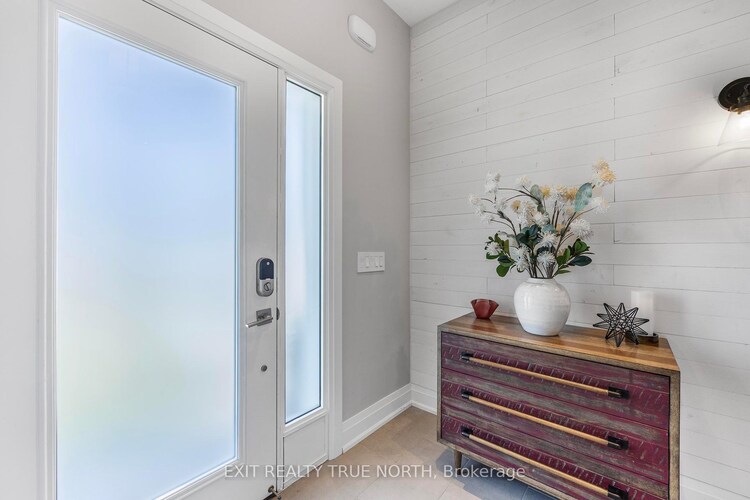 PREMIUM CORNER LOT, FAIRWAY VIEWS, & A BEAUTIFULLY CUSTOMIZED OAK BAY END UNIT! Unobstructed views of the 18th fairway and stunning Georgian Bay sunsets are just the beginning at this fully customized Oak Bay freehold end unit, set on a premium corner lot with no neighbours on one side. Built in 2020, this 2,100-plus-square-foot townhome begins with prominent front gables, a deep covered porch, a welcoming entry framed by sidelights, a built-in 2-car garage, and driveway parking for four more. Hardwood floors, custom Hunter Douglas blinds, pot lights, luxury lighting, and upgraded 6.5-inch baseboards with built-in outlets carry throughout. KitchenAid stainless steel appliances, a gas stove, pot filler, wine fridge, custom pantry, and well-chosen finishes give the kitchen a look that feels current and carefully considered. Soaring cathedral tray ceilings and a dramatic custom feature wall define the main living room, where a convection fireplace and two sets of double garden doors connect the space to the deck, private gazebo, golf course views, and Georgian Bay sunsets. The main floor primary bedroom features its own garden door walkout, custom walk-in closet, and a beautifully finished ensuite with an oversized shower, dual shower heads, dual sink vanity, and a private water closet. Ethernet connections in every room, a premium air filtration system, and a multi-zone Hydro-Rain sprinkler system round out a #HomeToStay that has been customized from top to bottom.