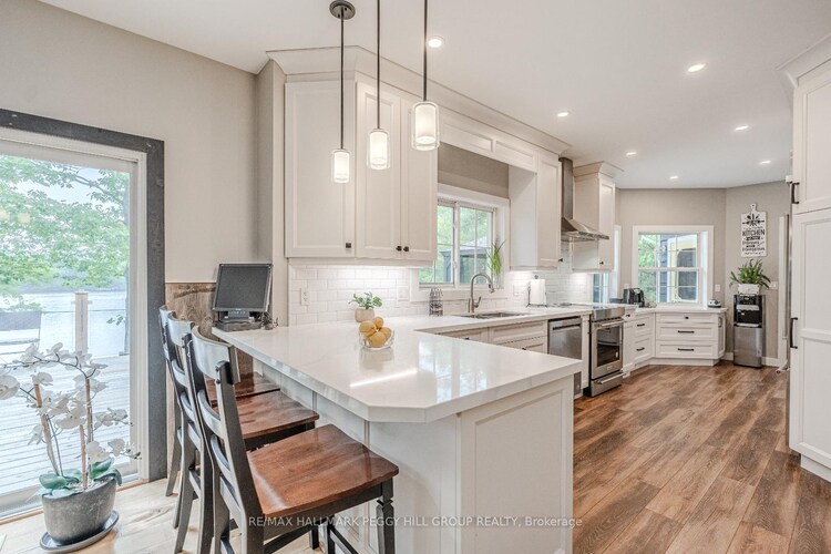 BOLD LAKESIDE BEAUTY WITH A SEPARATE SLEEPING CABIN, WATERFRONT DOCK & HEATED DETACHED GARAGE/SHOP! Perched in a coveted enclave overlooking the sparkling waters of Morrison Lake, this vibrant year-round retreat delivers everything you could want in a lakeside escape. The main home boasts character and functionality, featuring a bright, open layout with massive windows that capture serene lake views and flood the space with natural light. A show-stopping, fully remodelled kitchen steals the spotlight with sleek quartz counters, crisp white shaker cabinets, stainless steel appliances, subway tile backsplash, and a walk-in pantry, all crowned by stylish pendant lighting. The spacious living area offers a cozy wood stove, a massive window framing the lake, and a seamless connection to the dining room, perfect for entertaining or unwinding with a view. Three generously sized bedrooms, a well-appointed four-piece bath, and a warm, window-wrapped Muskoka room that brings in forest views and natural light complete the main home. Step outside to the expansive deck with updated glass panel railings and a covered gazebo, an entertainers dream with front-row seats to lakeside sunsets. Down by the water, a large dock with a floating swim platform invites endless summer fun. Need more space? A private sleeping cabin offers approx. 671 sq ft of additional comfort, with two bedrooms, 3 pc bathroom, wood stove, hydro, 60 amp panel, and its own front deck with stunning lake views. The detached double garage/shop is fully insulated, propane-heated and ready for projects, parking, or toys. With a gravel driveway, low-maintenance landscaping, three sheds, a fenced dog run, an outhouse and a 10kW generator powering most of the property, this one-of-a-kind lakeside package is ready to impress.