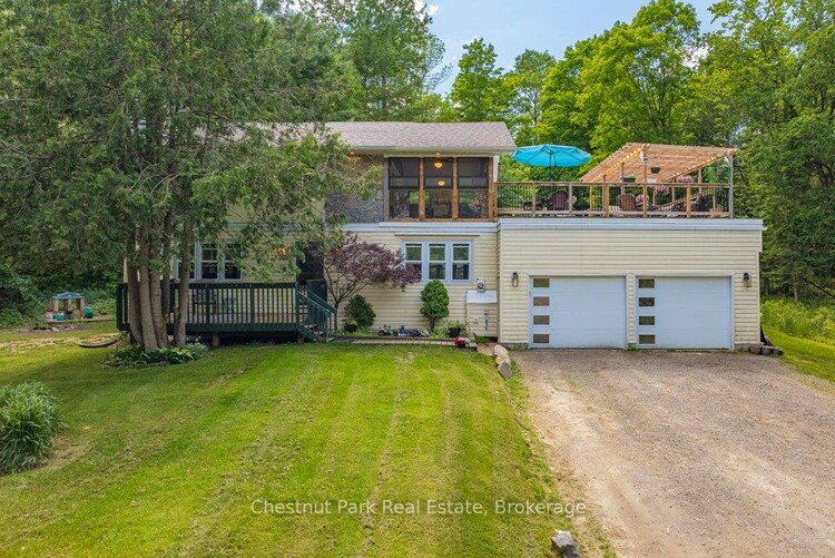 Sought after sunlit and spacious 3 bedroom, 2 bathroom recreational residence is an ideal home or cottage nestled in the heart of desirable Hidden Valley community. Ski to the hill or stroll to the fabulous 300'+ beachfront on prestigious Pen Lake with a private park featuring beach volleyball, bathroom, picnic tables, space to play or lounge as part of your membership in the Hidden Valley Property Owners Association. This residence offers an attached double car garage, such a bonus for your lifestyle and hard to find in Hidden Valley. Updated gourmet kitchen features large center eating island, gas stove, and all updated appliances in the beautiful open concept main living area with beautiful Muskoka stone gas fireplace to give the space a rustic and cozy feel while up to the minute decor surrounds you! Walk out from the main living area to your quintessential sunlit and spacious 3 season Muskoka room with another fireplace to take the chill out of those cool evenings. From there, stroll to your massive entertaining deck for bbqing, private dining, entertaining, sun bathing...your fabulous new life, you decide. 3 bedrooms on main level gives good privacy for sleeping from living areas. The lower level does not feel like a basement with a walk out door to your side yard. Great spot for an in law suite or family area with a 3rd gas fireplace and 4 pc bathroom. Privately set back from the quiet street with a level double driveway, ample for you and your guests. The shingles are new in 2022. Municipal water is also a bonus.