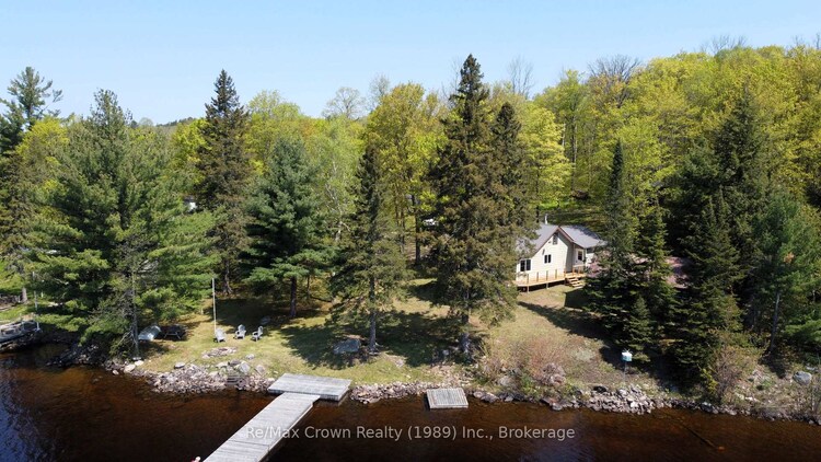 Classic Northern Ontario Cottage - Absolutely charming four-season cottage set on a private, level lot with over 200 feet of pristine, perfect shoreline on serene Duck Lake-part of the highly sought-after Pickerel River System, offering 40+ miles of boating, fishing, and family recreation. Inside features: eat-in kitchen area with mainfloor laundry, newly renovated 4-piece bathroom, vaulted living room with cozy wood stove and warm pine finishings, fun loft for the kids and a bright lakefront sunroom-which easily doubles as a third bedroom-providing a flexible space for family and guests. Stunning lake views are enjoyed from both indoors and out. Outside you will find newer decking, maintenance free steel roof, and exceptional privacy thanks to the natural treed setting and level topography. There is also an authentic log cabin currently used for storage - offers exciting potential for a future bunkie or guest space. A rare offering for buyers looking for a four-season waterfront retreat on a major waterway, complete with pristine shoreline and beautiful level lot.