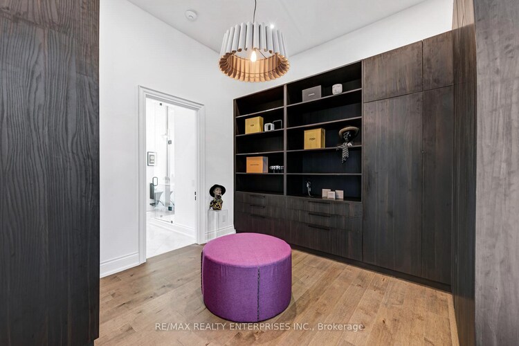 Set on a rare 172 ft wide pie-shaped lot, this magnificent custom-built French Transitional Château estate offers an extraordinary sense of space, privacy, and presence, expanding into a breathtaking backyard setting seldom found. A striking limestone facade, steep rooflines, and refined architectural detailing create a timeless, estate-like impression, surrounded by mature trees and landscaped grounds that enhance both privacy and curb appeal. Inside, the home is defined by grand scale and thoughtful design, beginning with a dramatic two-storey foyer and continuing into a breathtaking great room with soaring 24 ft ceilings and expansive windows that flood the space with natural light. At the heart of the home, the designer Muti kitchen is crafted for both performance and style, featuring sleek European-inspired cabinetry, quartz surfaces, and a full-height backsplash. An oversized waterfall island anchors the space with generous seating and prep area, complemented by integrated panelled appliances, a dedicated coffee and bar station, and a walk-in pantry, all seamlessly connected to the surrounding living and dining areas for effortless entertaining. The upper level offers a luxurious primary retreat with vaulted ceilings, a custom walk-in closet, and a spa-inspired ensuite, alongside generously sized bedrooms, each complete with hardwood flooring, custom closets, and private ensuites. The lower level extends the home's lifestyle offering with a dedicated home theatre, custom bar and lounge, private bedroom, and a fully equipped fitness room, delivering a complete luxury living experience designed for comfort, flexibility, and elevated everyday living.
