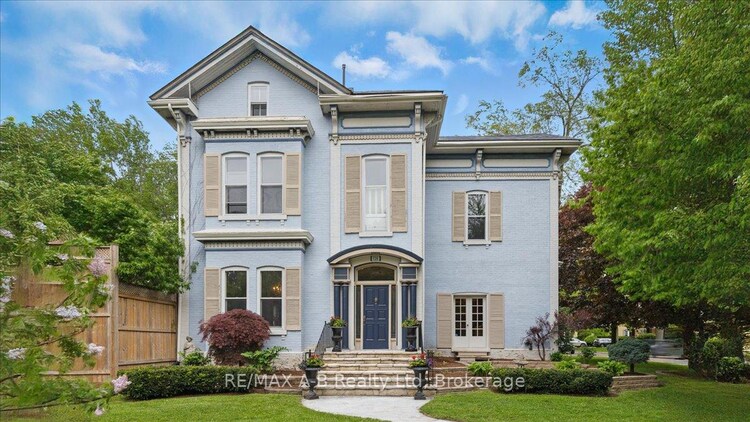 Welcome to this distinguished century home, rich with character and cultural heritage, nestled in one of Stratford's most desirable neighbourhoods. Once a charming bed and breakfast, this prominent residence has hosted many actors of the world-renowned Stratford Festival, echoing a legacy of warmth and elegance.Step into the grand front foyer, where the impressive staircase sets the tone for the craftsmanship found throughout. Stunning tigerwood flooring carries through the main level, enhancing each room with warmth and sophistication. The expansive great room, filled with natural light, opens through classic French doors to a picturesque stone patio. The main floor also includes a cozy sitting room, an elegant formal dining room, and a spacious kitchen with a walk-through pantry and original swinging door-a nod to the home's storied past. Upstairs, the second floor blends charm and functionality with the original maids' quarters, complete with den, bedroom, 3-piece bath, and private staircase. Three additional bedrooms include a generous primary with ensuite featuring a vintage clawfoot tub. A second clawfoot tub and a rare high-tank pull-chain toilet highlight the main bathroom. The third floor offers exceptional flexibility with two additional rooms suited for bedrooms, offices, or creative spaces, plus a large family room and storage. Outside, the landscaped backyard is a private retreat with an inground pool. A detached two-car garage and durable metal roof complete this exceptional property. Whether drawn to its history, space, or Stratford's vibrant arts scene, this home offers a rare opportunity to own a piece of the city's cultural fabric.