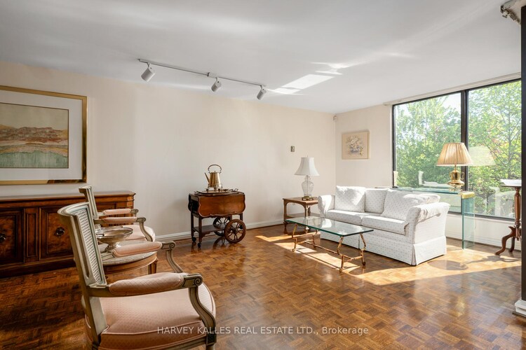 Welcome to this custom-designed luxury residence at York Mills Place, ideally located at 3900 Yonge Street, Unit 405, in the prestigious Bedford Park-Nortown community. Spanning 1,823 sq. ft., this elegant condo offers 2 bedrooms plus a den and 3 bathrooms, with a refined, wide plank oak flooring throughout, bespoke millwork, floor-to-ceiling windows, and a desirable south-east exposure. The expansive open-concept living and dining areas walk out to a balcony with greenbelt, ravine, and city skyline views. The contemporary chef's kitchen features quartz waterfall edge countertops and matching backsplash, premium built-in integrated appliances, a wine fridge, and a generous breakfast bar. The spacious primary bedroom includes a walk-in closet and spa-inspired 5-piece ensuite with double vanity, soaking tub, and separate shower, while the second bedroom offers its own private 3-piece ensuite. A separate den with a large window provides ideal flexibility for a home office or guest space, complemented by a dedicated laundry room with built-in shelving and sink. This residence includes two owned underground parking spaces and an exclusive locker, with all-inclusive maintenance fees covering heat, hydro, water, cable TV, central air conditioning, parking, and building insurance. Residents are community oriented and enjoy events like wine & cheese BBQ's, card games, bingo nights, exercise classes and while benefiting from full-service amenities including 24-hour concierge/security, indoor pool, fitness centre, sauna, car wash, visitor parking, and elevators. Ideally situated steps to Yonge Street transit, minutes to York Mills Subway Station and Highway 401, and close to York Mills Park, Hoggs Hollow Park, Don Valley Golf Course & Rosedale Golf Club, as well as top-rated schools, libraries, and everyday shopping and dining, this home delivers spacious, sophisticated living with exceptional convenience. **Listing contains virtually staged photos**