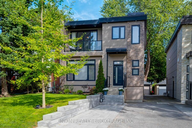 Welcome to 47 Eastville Avenue. A spectacular family home tucked into one of Scarborough's most coveted pockets, just steps from the Bluffs, where thoughtful design meets everyday luxury. This extensively upgraded home truly has it all. Offering 4 + 2 bedrooms and 4 bathrooms, including a main floor powder room and a primary ensuite, both with heated floors and every level filled with upgrades. The beautiful, open concept main floor features soaring 10 foot ceilings, and a striking gas fireplace that anchors the space. The chef inspired kitchen flows seamlessly into the living and dining areas, with a walkout to a covered deck and expansive backyard perfect for entertaining or relaxing with family.Upstairs, you will find four generously sized bedrooms, flooded with natural light from large windows and hallway skylights. Nine foot ceilings enhance the sense of space, while the serene primary retreat overlooks the backyard and includes a walk in closet and a beautifully finished spa inspired ensuite with heated floors. Custom closets throughout the home offer exceptional storage. The lower level delivers flexibility without compromise. A separate entrance, nine foot ceilings, a spacious rec room, two additional bedrooms, and a full bathroom with heated flooring. Rough ins are already in place for a kitchen, making this space ideal for a nanny suite, in law living, or future income potential. Outside, this property truly shines with a lush private backyard framed by mature trees, a newly landscaped patio and a covered deck for year round use. It's truly an entertainer's dream and a perfect space for kids to play. Additional features include a one car garage, ample driveway parking, and a remineralized alkaline water system for clean, high quality drinking water that is such a luxurious perk.